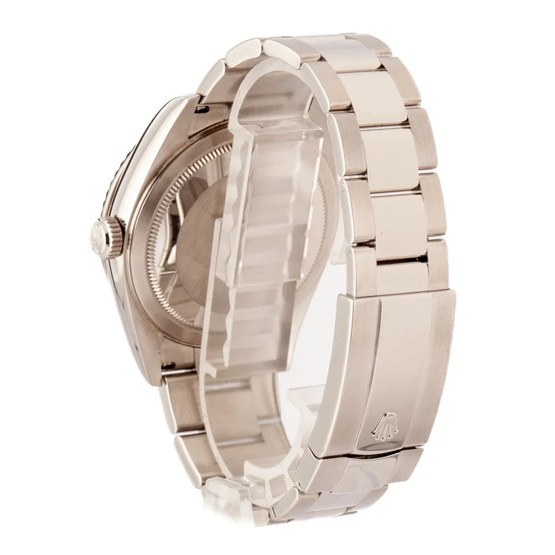 Oder vielleicht ist es dieses auffllige, leuchtend blaue Zifferblatt, das alles verndert hat. Es ist leicht zu erkennen, wie der satte Blauton einen schnen Kontrast zum schlanken Stahlgehuse und der glitzernden geriffelten Lünette aus Weigold bildet. Darüber hinaus schafft das Blau die perfekte Bühne dafür, dass die mit Leuchtmasse gefüllten Strichmarkierungen, der weie Text und die roten Akzente auf dem Zifferblatt richtig zur Geltung kommen. Das blaue Zifferblatt ist raffiniert, verleiht der Uhr jedoch mehr Persnlichkeit als die gedmpften weien und schwarzen Zifferbltter, die auch bei der weien Rolesor Sky-Dweller erhltlich sind. Ursprünglich war die Rolex Sky-Dweller 26934 nur mit einem sportlichen dreigliedrigen Oyster-Stahlarmband erhltlich. Im Jahr 2021 fügte Rolex jedoch optional auch das elegantere Jubilee-Stahlarmband mit fünf Gliedern hinzu.